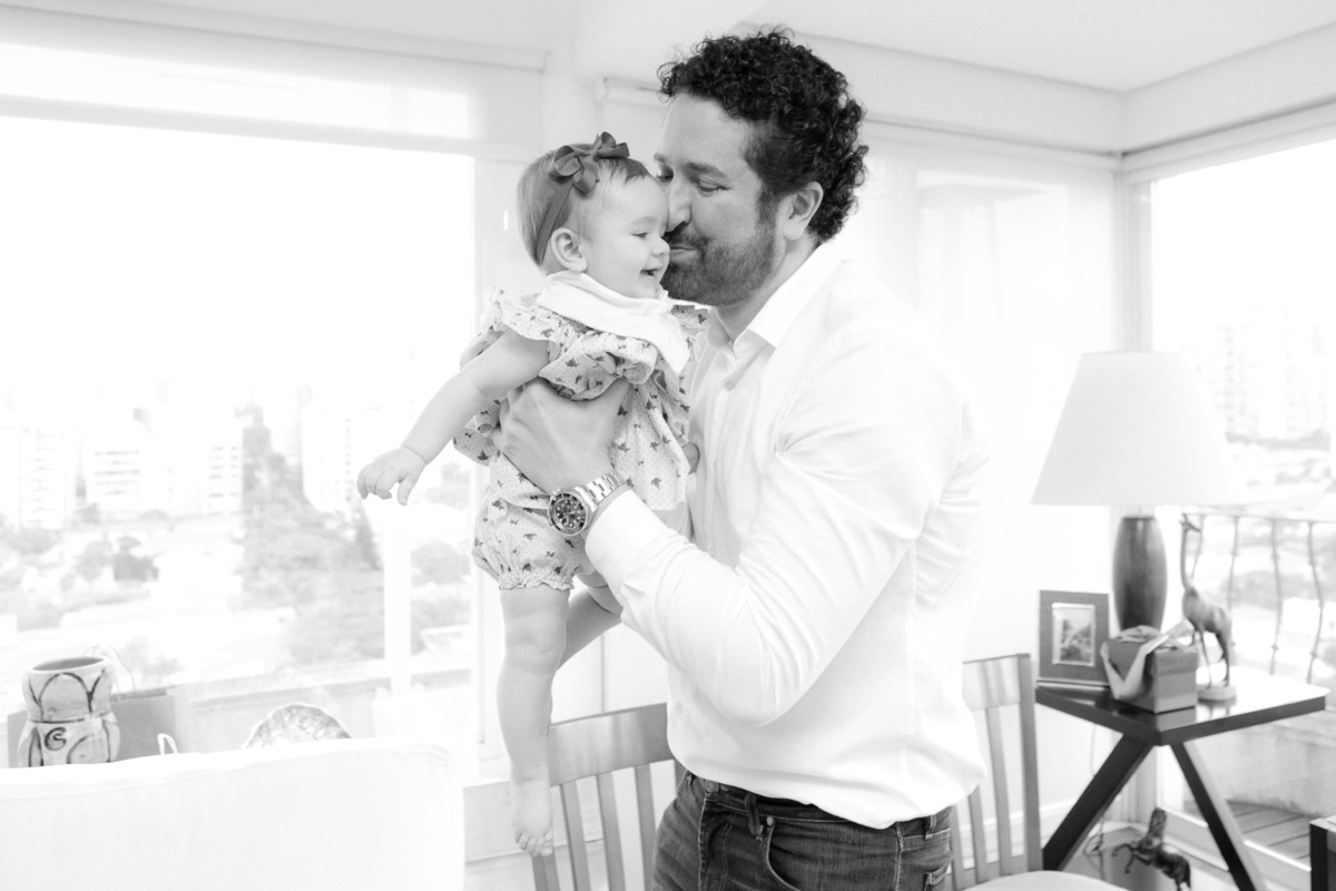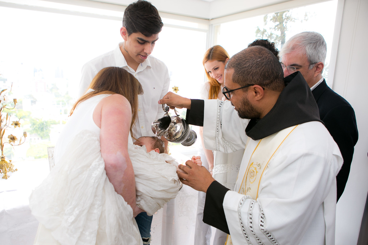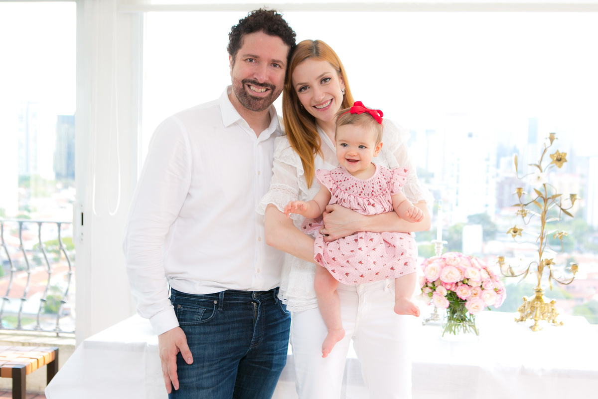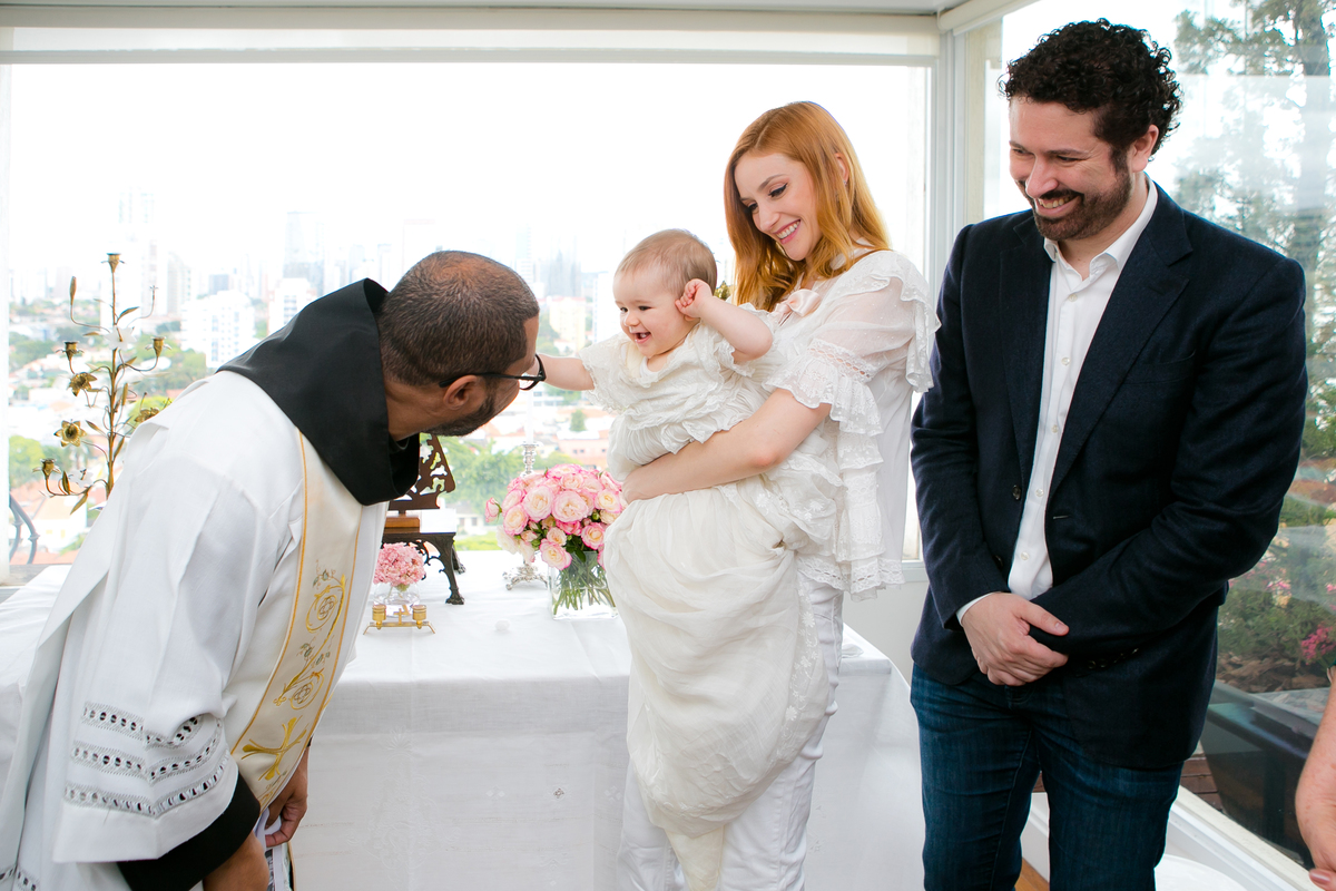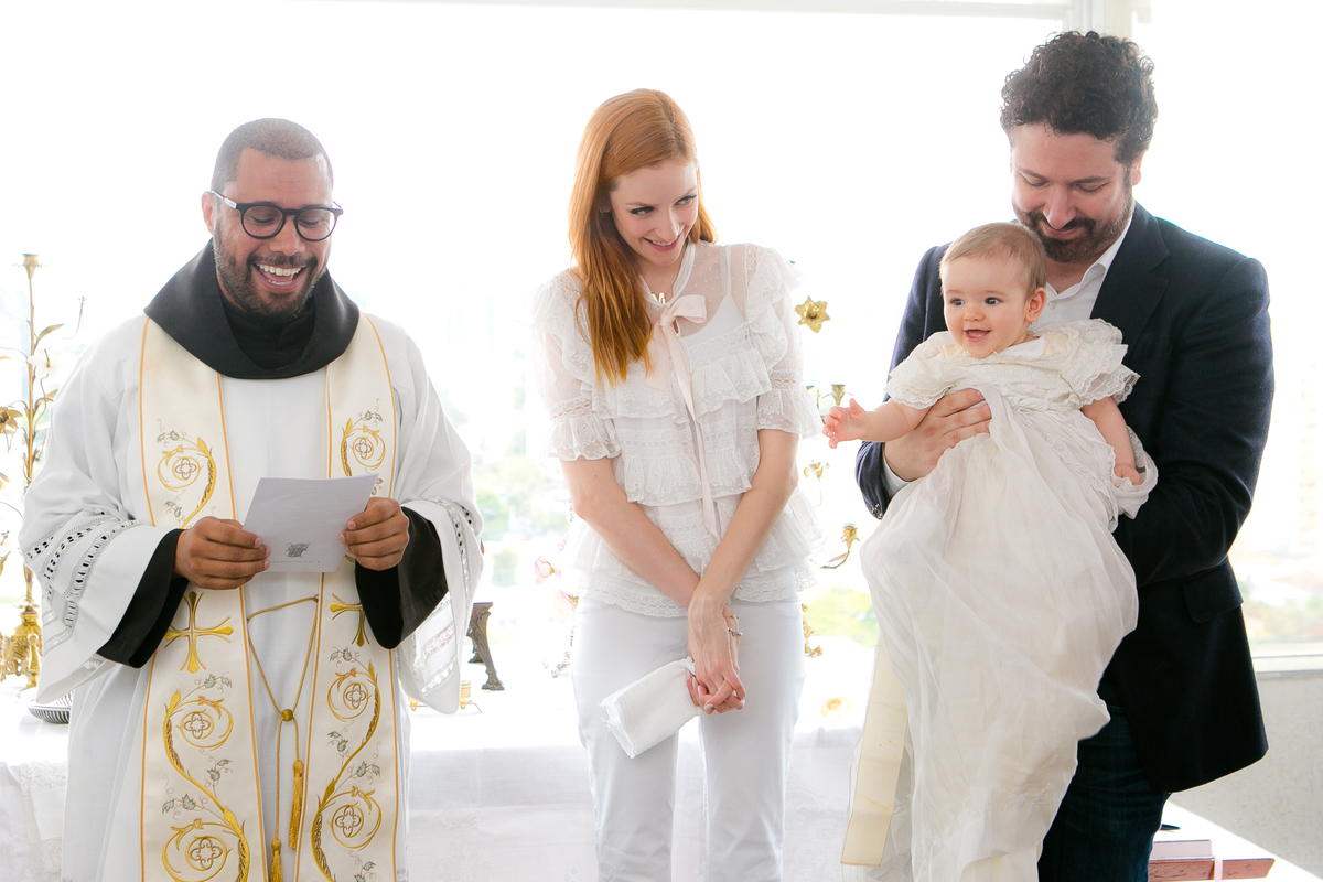 Os papais Carlos e Marina escolheram um lugar especial para que sua pequena recebesse o primeiro sacramento: a própria casa